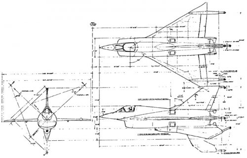 | 3-view drawing of the Ryan Model 115C tail-sitting supersonic VTOL jet fighter |